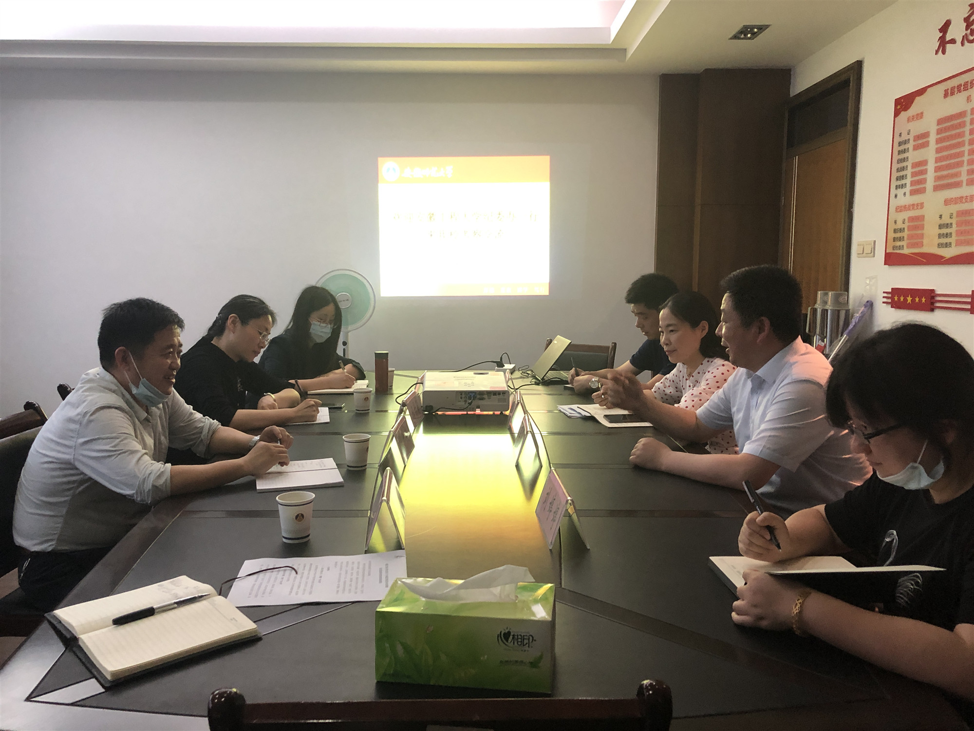 学校纪委副书记、纪委办主任张开炳带领相关工作人员首先实地走访了安徽师范大学“走读式”谈话室。该校纪委副书记、纪委办主任吴春雷热情接待了张开炳一行,详细介绍了谈话室建设情况。随后,双方人员围绕“走读式”谈话安全、制度规定执行、人员管理等方面的整改情况相互做了介绍,交换查看了各自整改材料,并就进一步推进整改工作的落实提出了意见建议。